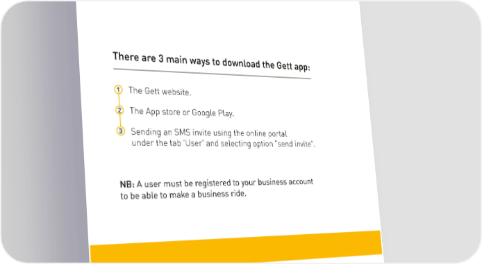 HOW TO DOWNLOAD THE GETT APP There are 3 main ways to download the Gett app: 1 The Gett website. 2 The App Store or Google Play. 3 Sending an SMS invite using the online portal under the tab ‘User’ and selecting option ‘Send Invite’. NB: A user must be registered to a business account to be able to make a business ride. 4
