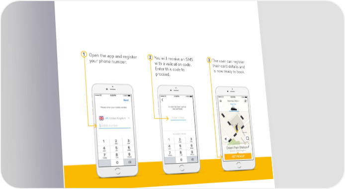 1 Open the app and register 2 You will receive an SMS 3 The user can register your phone number. with a validation code. their card details and Enter this code to is now ready to book. proceed. 5
