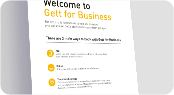 INTRODUCTION Welcome to Gett for Business The aim of this handbook is to help you navigate your way around Gett’s online booking platform and app. There are 3 main ways to book with Gett for Business App Quick, easy and enables booking and editing of rides individually even if booked by someone else. Online Quick, easy and possible to book on behalf of others. Telephone bookings Only recommended for journeys which may be more complicated and require further attention. Please remember you will need your Account ID to make a telephone booking. If anything remains unclear please contact your account manager for further support. We hope you enjoy using Gett for Business, Gett for Business Team. 2