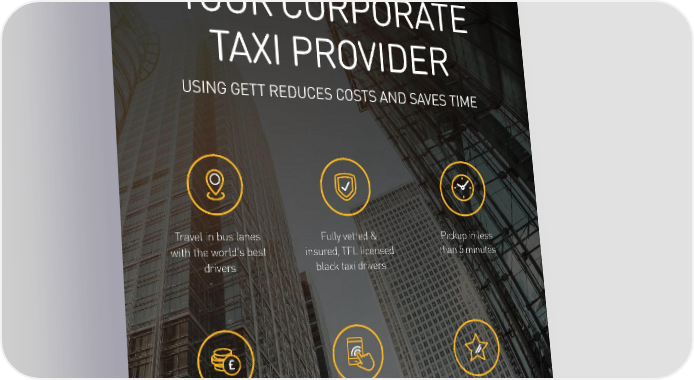 YOUR CORPORATE TAXI PROVIDER USING GETT REDUCES COSTS AND SAVES TIME Travel in bus lanes Fully vetted & Pickup in less with the world’s best insured, TFL licensed than 5 minutes drivers black taxi drivers Fixed price fares Book instantly via Biggest black taxi over 6 miles the app or web provider in the UK (over 15 000 drivers)
