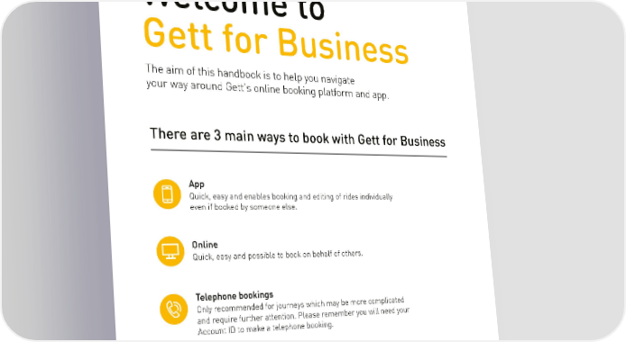 INTRODUCTION Welcome to Gett for Business The aim of this handbook is to help you navigate your way around Gett’s online booking platform and app. There are 3 main ways to book with Gett for Business App Quick, easy and enables booking and editing of rides individually even if booked by someone else. Online Quick, easy and possible to book on behalf of others. Telephone bookings Only recommended for journeys which may be more complicated and require further attention. Please remember you will need your Account ID to make a telephone booking. If anything remains unclear please contact your account manager for further support. We hope you enjoy using Gett for Business, Gett for Business Team. 2