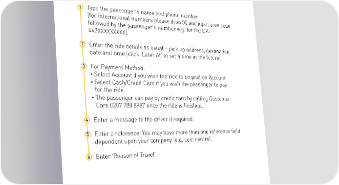 HOW TO BOOK ON BEHALF OF A NON-REGISTERED USER (see image next page over) 1 Type the passenger’s name and phone number (for international numbers please drop 00 and input area code followed by the passenger’s number e.g. for the UK: 447XXXXXXXXX). 2 Enter the ride details as usual – pick up address, destination, date and time (click ‘Later At’ to set a time in the future). 3 For Payment Method: Select Account if you wish the ride to be paid on Account Select Cash/Credit Card if you wish the passenger to pay for the ride The passenger can pay by credit card by calling Customer Care 0207 788 8987 once the ride is finished. 4 Enter a message to the driver if required. 5 Enter a reference. You may have more than one reference field dependent upon your company (e.g. cost centre). 6 Enter ‘Reason of Travel’. 22 22