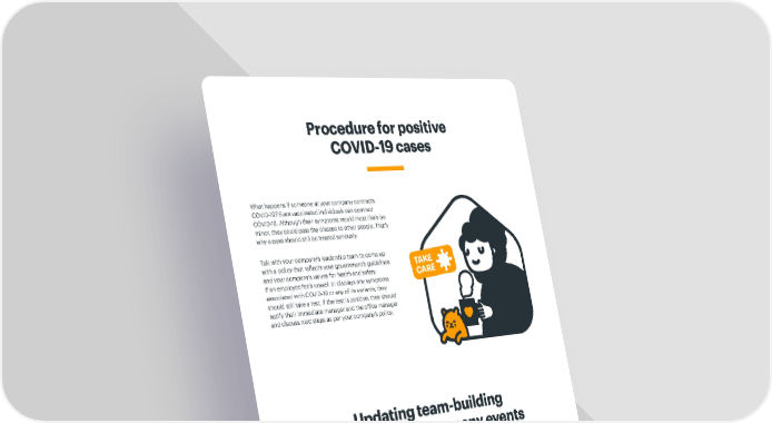 What happens if someone at your company contracts COVID-19? Even vaccinated individuals can contract COVID-19. Although their symptoms would most likely be minor, they could pass the disease to other people. That’s why a case should still be treated seriously. Talk with your company’s leadership team to come up with a policy that reflects your government’s guidelines and your company’s values for health and safety. If an employee feels unwell or displays any symptoms associated with COVID-19 or any of its variants, they should still take a test. If the test is positive, they should notify their immediate manager and the office manager and discuss next steps as per your company’s policy. Some companies might be eager to return to their same team-building activities and company events. Others might choose to reduce group activities in order to lower the likelihood of viral spread. Your choice might depend on vaccination uptake, city rates, and employee comfort level. With your survey or focus group, get a sense for what employees are comfortable with. If you do plan to host an event, make sure to consider the handling of food and other items. Maybe hot potato and music chairs aren’t such good ideas any more. Small compostable dishes with individual servings of dips might be a better idea than a big bowl of dip that everyone scoops out of. Procedure for positive COVID-19 cases Updating team-building practices and company events TAKE CARE 15 gett.com