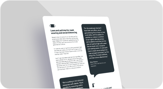 Laws and policies for mask wearing and social distancing Research what the laws will look like when you first welcome everyone back to the office, and how they might change over the first six months following the return. This way, you’ll be prepared with company guidelines and policies. For example, even during times when government mask mandates are inactive, you might want to have a policy in place that states that employees are able to continue wearing masks if they wish. And if mask mandates come back into legal effect, you might enforce them in hallways and common areas, but allow employees to take them off in their offices or cubicles, provided there’s enough space on all sides. But please don’t take our word as gospel and check out the restrictions for your office location. Typically you can find these in the UK on the gov.uk website. “We’re working to limit physical interaction with clients. This is possible by executing orders via the Internet or telephone, contactless delivery or controlled entry of persons (while avoiding crowds outside the premises) and physical distancing inside and outside the business premises.” Mike Sheety, founder of That Shirt Sanitizing hot desks and common spaces according to schedule Many companies are increasing the frequency of their cleaning schedules. If hot desk availability is mapped out daily, then each hot desk will need to be cleaned at the end of every day. For common areas, you might also clean these every day instead of once a week. “For the employees that don’t have their own office, we are guaranteeing them at least six feet on all sides, with the option of a partition or cubicle. In addition to our nightly cleaning service, we’ve added a lunch-hour service that will sanitize high-traffic areas like the break room, reception, and meeting rooms. I’m sure we’ll have to adjust as we navigate the ‘new company workplace,’ but first things first. Employee wellness, and then follows effectiveness.” Alison Pearson, Head of HR at Hal Waldman and Associates 10 gett.com