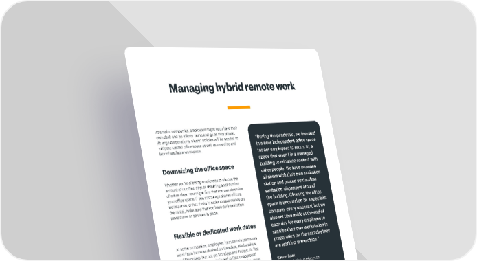 At smaller companies, employees might each have their own desk and be able to come and go as they please. At large corporations, clearer policies will be needed to mitigate wasted office space as well as crowding and lack of available workspace. Downsizing the office space Whether you’re allowing employees to choose the amount of in-office days or requiring a set number of office days, you might find that you can downsize your office space. If you encourage shared offices, workspaces, or hot desks in order to save money on the rental, make sure that you have daily sanitation procedures or services in place. Flexible or dedicated work dates At some companies, employees from certain teams can work from home as desired on Tuesdays, Wednesdays, and Thursdays, but not on Mondays and Fridays. At first glance, this rule seems designed to limit unapproved extended weekends. So, if you do create policies, make sure that they are easy to understand and don’t risk damage to your company culture by sowing distrust. Google, by contrast, is allowing employees to work with their managers to pick their two work-from-home days and their three work-from-the-office days. Google is also building movable pods with desks and whiteboards that can be rearranged as needed around the office. Hot desk availability management If you plan on having employees share desks as a method of saving on office rent, you’ll need to make sure there are enough spaces available, and that everyone knows when they can and can’t come in. Fortunately, there are no spreadsheets or massive calendars required. You can use a hot desk and hybrid work management software such as Envoy, Chargify, or Office Space to make it easy for employees to claim their spot. Managing hybrid remote work “During the pandemic, we invested in a new, independent office space for our employees to return to, a space that wasn't in a managed building to minimise contact with other people. We have provided all desks with their own sanitation station and placed contactless sanitation dispensers around the building. Cleaning the office space is undertaken by a specialist company every weekend, but we also set time aside at the end of each day for every employee to sanitise their own workstation in preparation for the next day they are working in the office.” Simon Brisk, Founder of Click Intelligence 7 gett.com