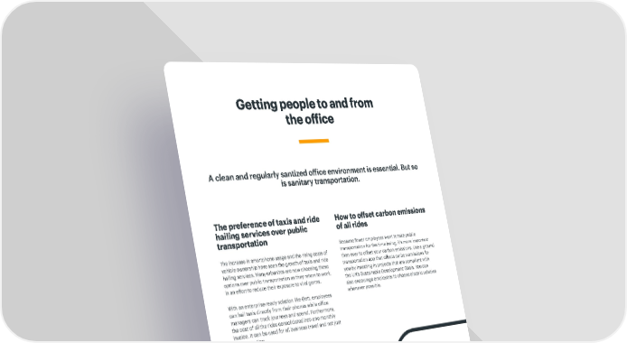 A clean and regularly santized office environment is essential. But so is sanitary transportation. Getting people to and from the office The preference of taxis and ride hailing services over public transportation The increase in smartphone usage and the rising costs of vehicle ownership have seen the growth of taxis and ride hailing services. Many urbanites are now choosing these options over public transportation as they return to work, in an effort to reduce their exposure to viral germs. With an enterprise-ready solution like Gett, employees can hail taxis directly from their phones while office managers can track journeys and spend. Furthermore, the cost of all the rides consolidated into one monthly invoice. It can be used for all business travel and not just for commuting. How to offset carbon emissions of all rides Because fewer employees want to take public transportation for the time being, it’s more important than ever to offset your carbon emissions. Use a ground transportation app that offsets carbon emissions for you by investing in projects that are compliant with the UN’s Sustainable Development Goals. You can also encourage employees to choose electric vehicles whenever possible. Ride greener with Gett All Gett UK rides are carbon neutral – we offset every gram of CO2 emitted via our partnership with EcoAct Choose Gett Green to add £1.99 to your ride to fund green projects via our partnership with Trees for Cities 13 gett.com