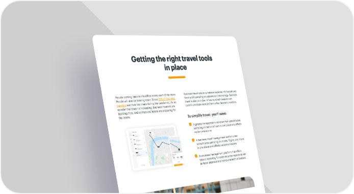 People coming back to the office is only part of the story. People will also be leaving town. Since 33% of business travelers say they lost deals during the pandemic, it’s no wonder that travel is increasing. Business travelers are booking trips, and airlines and hotels are preparing for the boom. Getting the right travel tools in place Business travel can be a massive expense. It’s typically up there with spending on salaries and technology. Business travel is also complex. A few hundred travelers can quickly produce receipts from a few thousand vendors. To simplify travel, you’ll need: A ground transportation solution that consolidates spending on taxis and cars in one place and offsets carbon emissions A business travel management platform that consolidates spending on hotels, flights, and trains in one place and offsets carbon emissions An expense management platform that offers receipt scanning for quick expense reports as well as faster approval and reimbursement processes What is Gett? Gett gives your travelers access to taxis, ride-hailing services, and even limos in cities around the world, all from an easy-to-use mobile app. You get consolidated invoicing, spend reporting, and carbon emission offsetting (within the UK) for simpler and greener ground transportation. 16 gett.com