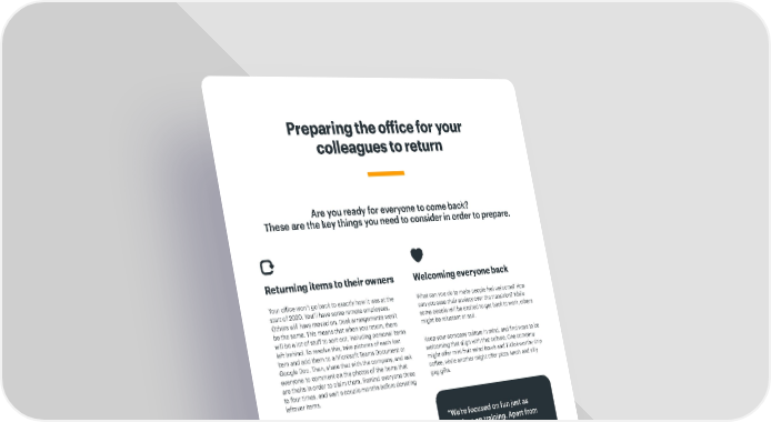 Are you ready for everyone to come back? These are the key things you need to consider in order to prepare. Preparing the office for your colleagues to return Returning items to their owners Your office won’t go back to exactly how it was at the start of 2020. You’ll have some remote employees. Others will have moved on. Desk arrangements won’t be the same. This means that when you return, there will be a lot of stuff to sort out, including personal items left behind. To resolve this, take pictures of each lost item and add them to a Microsoft Teams Document or Google Doc. Then, share that with the company, and ask everyone to comment on the photos of the items that are theirs in order to claim them. Remind everyone three to four times, and wait a couple months before donating leftover items. “We’re focused on fun just as much as on training. Apart from the cleaning preparation, I’ve assembled goodie bags with fun treats, bubbles, whistles, lip chap, and such for the day we return. We’ll also do a theme day each Friday for a few weeks to bring things back to a team feel. And Puppy Thursday will resume, where employees are invited to bring their socialized dogs to work” Maria Ferronato, Office Manager at The Gentleman Pros Welcoming everyone back What can you do to make people feel welcome? How can you ease their anxiety over the transition? While some people will be excited to get back to work, others might be reluctant or sad. Keep your company culture in mind, and find ways to be welcoming that align with that culture. One company might offer mini fruit salad bowls and TikTok-worthy drip coffee, while another might offer pizza lunch and silly gag gifts. Ordering new supplies While this might seem obvious, ordering new office supplies could get forgotten in the hubbub of organizing actual people for the first time in a while. We’re sure last year’s lunch leftovers have been tossed, but there might be some other things that have expired. For example, if you have office snacks and powdered coffee creamer, you might want to check the expiration dates. Next, review the stock of all of your most essential supplies. Consider how quickly important supplies might get used once everyone returns. Toilet paper, paper, and pens are all things that might have moved slowly with a small percentage of your workforce at this office. But with things in full swing, you wouldn’t want to run out suddenly. Later in this guide, we explore ways to make your office greener than ever. 9 gett.com