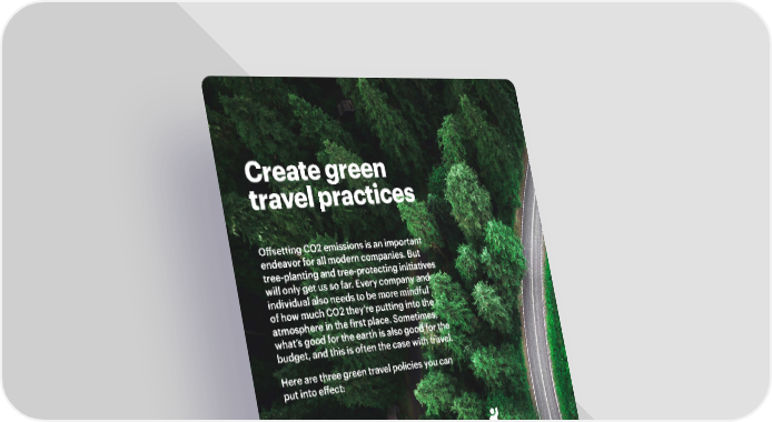 Create green travel practices Offsetting CO2 emissions is an important endeavor for all modern companies. But tree-planting and tree-protecting initiatives will only get us so far. Every company and individual also needs to be more mindful of how much CO2 they’re putting into the atmosphere in the first place. Sometimes, what’s good for the earth is also good for the budget, and this is often the case with travel. Here are three green travel policies you can put into effect: Walking under a certain distance With Gett, you can set up a travel policy that encourages or requires employees to walk for trips under a certain distance. And of course, you can set individual policies to allow cars for all distances for people with disabilities. Trains over planes Using a travel management platform like TravelPerk, you can encourage or require travelers to book trains instead of planes for certain distances, as trains emit less CO2 per person per trip. Carpooling when available One of Gett’s more advanced features for large companies is carpooling. When hiring a car, employees can be required to hop in a carpool if someone from your company is already headed in a similar direction. Once the policy is set up, putting it into effect is easy and automatic. 11