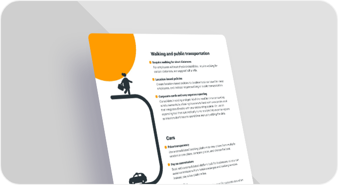 Cars Price transparency Use a consolidated booking platform to view prices from multiple vendors in one place, compare prices, and choose the best. Pay no commissions Book with a consolidated platform built for businesses, so you can avoid commissions from hotel concierges and booking services. Instead, pay a low platform fee. Carpooling Use carpooling features to reduce the need for separate cars when employees are traveling near and around the office. Location-based policies Use geo-location to create the right travel policies. Maybe employees can’t hire cars locally, or local travel can only occur from the office to nearby public transit stations. Seniority-based policies Give executives and senior leaders a unique set of policies to allow for nicer cars for short distances, or work-to-home travel. Time-based policies Allow work-to-home travel after dark so employees can get home safely without having to walk or use public transportation. Car-type policies Make sure that only senior executives are using black taxis, but not for long distances. Walking and public transportation Require walking for short distances For employees without physical disabilities, require walking for certain distances, we suggest half a mile. Location-based policies Create location-based policies to disallow local car travel for most employees, and instead require walking or public transportation. Corporate cards and easy expense reporting Consolidate invoicing and get rid of the need for time-consuming reimbursements by allowing travelers to book with a corporate card that integrates directly with your accounting system. Or, use an expensing tool that automatically turns receipts into expense reports so travelers don’t have to spend time manually adding the data. 14
