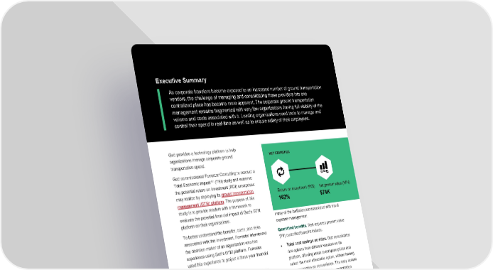 THE TOTAL ECONOMIC IMPACT™ OF GETT GROUND TRANSPORTATION MANAGEMENT PLATFORM 1 Executive Summary As corporate travelers become exposed to an increased number of ground transportation vendors, the challenge of managing and consolidating those providers into one centralized place has become more apparent. The corporate ground transportation management rema ins fragmented with very few organizations having full visibility of the volume and costs associated with it. Leading organizations need tools to manage and control their spend in real - time as well as to ensure safety of their employees. Gett provides a technology platform to help organizations manage corporate gro und transportation spend. Gett commissioned Forrester Consulting to conduct a Total Economic Impact™ (TEI) study and examine the potential return on investment (ROI) enterprises may realize by deploying its g round t ransportation m anagement (GTM) p latform . The purpose of this study is to provide readers with a framework to evaluate the potential financial impact of Gett's GTM platform on their organizations. To better understand the benefits, costs, and risks associated with this in vestment, Forrester interviewed the decision - maker of an organization who has experience using Gett ’s GTM platform . Forrester used this experience to project a three - year financial analysis. Prior to using Gett ’s GTM platform , the interviewee noted how th eir organization struggled to monitor and manage ground transportation spend. Even though there were company travel policies in place, the organization faced practical challenges in enforcing those rules. Moreover, the processes of booking and managing rid es as well as submitting and processing expense claims were inefficient and time - consuming. KEY FINDINGS Gett’s GTM platform provided the organization with the opportunity to set up, adjust and enforce company travel policies and reduce the overall number of out - of - policy rides taken. It also removed many of the inefficiencies associated with tr av e l expense management. Quantified benefits. Risk - adjusted present value (PV) quantified benefits include: • To tal cost savings on rides. Gett consolidates ride options from different vendors on its platform, allowing users to compare prices and select the most affordable option , without having to compromise on convenience . The eas y access to lowe r - priced rides helped the organization sav e about $52,000 over three years. • Total s avings from improved compliance with travel policies. Prior to Gett , the organization found it difficult to efficiently enforce its employee travel policies. As a result, employees often ended up taking rides that were not compliant with its travel policies. With Gett , users are only presented with ride options tha t they qualify for, allowing the organization to enforce its travel policies smoothly. By reducing the number of Return on investment (ROI) 162% Net present value (NPV) $74K KEY STATISTICS