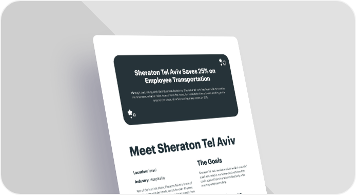 Sheraton Tel Aviv Saves 25% on Employee Transportation Through partnering with Gett Business Solutions, Sheraton Tel Aviv has been able to provide more secure, reliable rides, to and from the hotel, for hundreds of employees working shifts around the clock, all while cutting travel costs by 25%. Meet Sheraton Tel Aviv Location: Israel The Goals Industry: Hospitality Sheraton Tel Aviv needed a solution which provided quick and reliable, round-the-clock services that Part of the Marriott chain, Sheraton Tel Aviv is one of could scale efficiently and cost effectively, while Israel’s most popular hotels, which for over 40 years, ensuring employee safety. has provided exceptional, 24/7 service to guests from all over the world. The Challenges Sheraton Tel Aviv provides 24/7 service, with employees working in shift patterns, who are required to travel, even when public transportation isn't available. With hundreds of employees, travelling at all hours, Sheraton Tel Aviv needed to better monitor travel activity and manage their costs. SHERATON TEL AVIV CASE STUDY gett.com