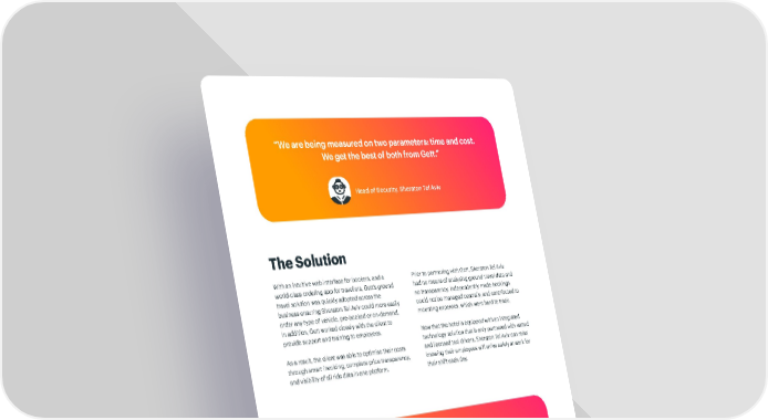 “We are being measured on two parameters: time and cost. We get the best of both from Gett.” Head of Security, Sheraton Tel Aviv The Solution With an intuitive web interface for bookers, and a Prior to partnering with Gett, Sheraton Tel Aviv world-class ordering app for travellers, Gett's ground had no means of analysing ground travel data and travel solution was quickly adopted across the no transparency. Independently made bookings business ensuring Sheraton Tel Aviv could more easily could not be managed centrally, and contributed to order any type of vehicle, pre-booked or on-demand. mounting expenses, which were hard to track. In addition, Gett worked closely with the client to provide support and training to employees. Now that the hotel is equipped with an integrated technology solution that is only partnered with vetted As a result, the client was able to optimise their costs and licensed taxi drivers, Sheraton Tel Aviv can relax through smart invoicing, complete price transparency, knowing their employees will arrive safely at work for and visibility of all ride data in one platform. their shift each day. “I feel like I'm getting a VIP service from our account manager. We analyse our data each month together, and if there are any problems or delays, we get quick answers and solutions. We can see that there is always a pursuit for improvement, becoming more efficient and preventing future issues.” Head of Security, Sheraton Tel Aviv SHERATON TEL AVIV CASE STUDY gett.com