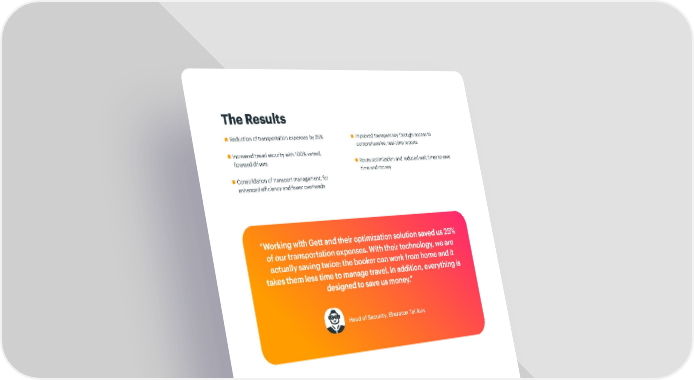 The Results Reduction of transportation expenses by 25% Improved transparency through access to comprehensive, real-time reports Increased travel security with 100% vetted, licensed drivers Route optimization and reduced wait times to save time and money Consolidation of transport management, for enhanced efficiency and fewer overheads “Working with Gett and their optimization solution saved us 25% of our transportation expenses. With their technology, we are actually saving twice: the booker can work from home and it takes them less time to manage travel. In addition, everything is designed to save us money.” Head of Security, Sheraton Tel Aviv SHERATON TEL AVIV CASE STUDY gett.com