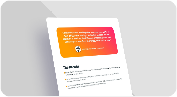 “For our employees, booking a taxi for work should not be any more difficult than booking a taxi in their personal life - any approvals or invoicing should happen in the background. With Gett's easy-to-use web portal and app, it really is that easy.” Declan McAlister, Head of Procurement The Results The identification and elimination of hidden costs, including savings of hundreds of staff hours through lowered wait times and reduced red tape The transition to carbon-neutral travel, putting Tate on track to hit its stated target of a 10% reduction in the company’s carbon footprint by 2023 An intuitive interface leading to high levels of platform adoption and a 212% increase in managed rides, enabling the company to consolidate and scale company-wide transport operations TATE CASE STUDY gett.com